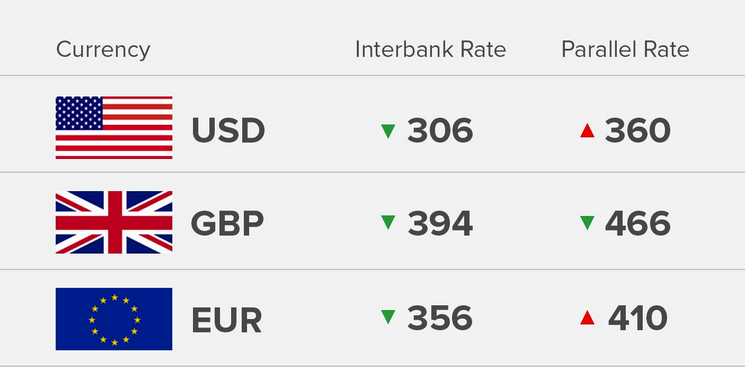 Today’s 4/9/2018) exchange rate of the Nigerian Naira against the Dollar, Pound and Euro.