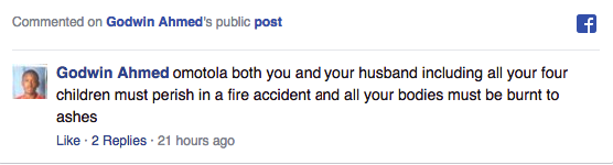 “omotola both you and your husband including all your four children must perish in a fire accident and all your bodies must be burnt to ashes.”