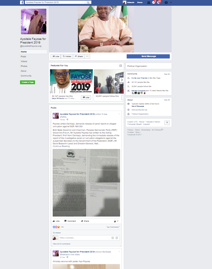 Ekiti State Governor, Mr. Ayodele Fayose, has launched his presidential campaign on Facebook.