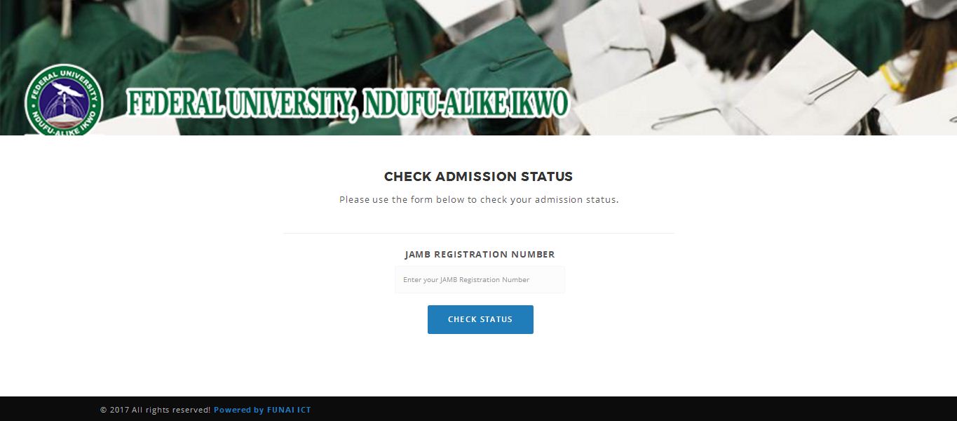 The management of Federal University, Ndufu-Alike, Ikwo (FUNAI), Ebonyi State wishes to inform candidates who scored 180 and above in the Unified Tertiary Matriculation Examination (UTME) and applied through Joint Admissions and Matriculation Board (JAMB) to study at the University for the 2017/2018 Academic Session, and sat for the institution’s Post–UTME Screening Exercise that the first batch of the provisional admission list is out.
