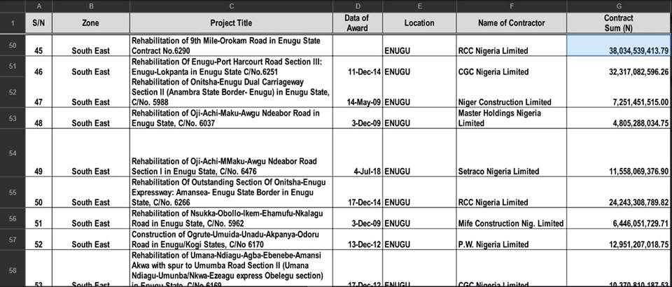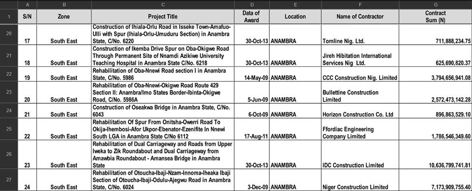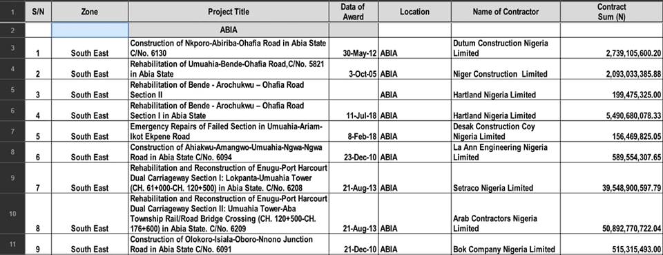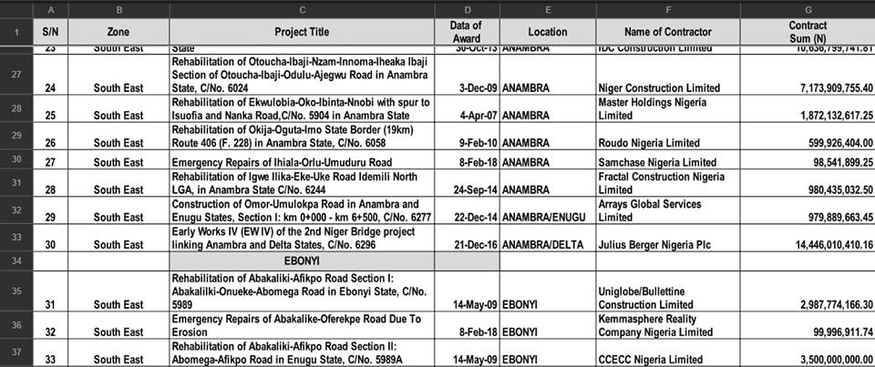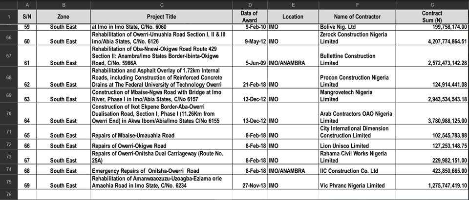 The Federal Government (FG) on Monday released a list of the 69 ongoing road and bridge projects in the South-east region of the country.