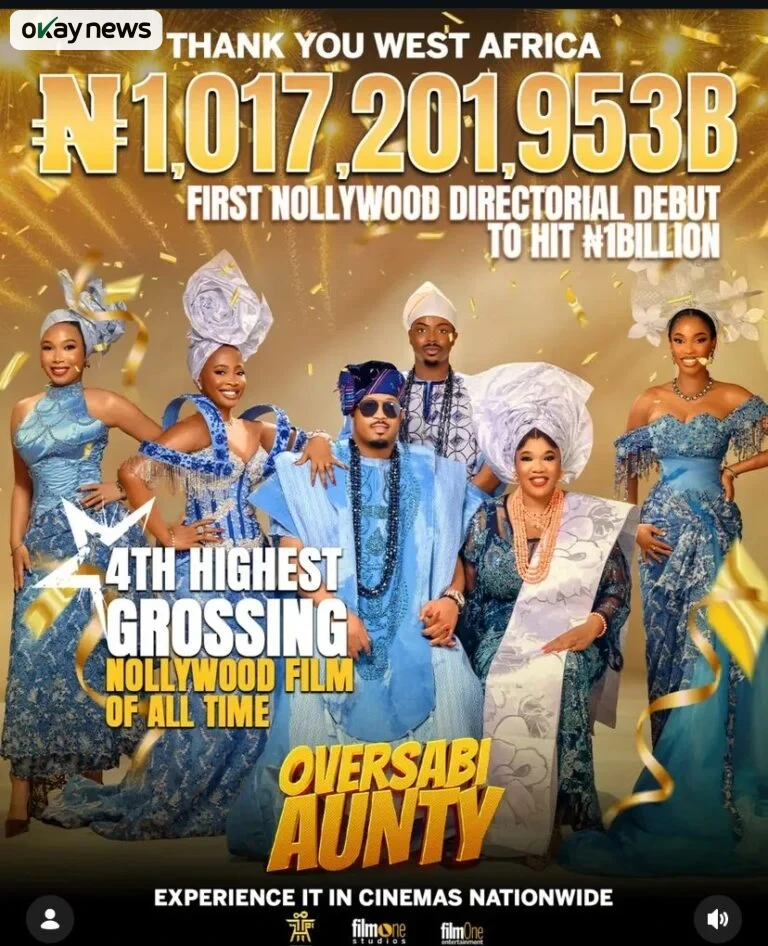 The distributor also said the achievement makes Oversabi Aunty the fourth highest-grossing Nollywood film of all time. It added that the movie is the first Nollywood directorial debut to reach the ₦1,000,000,000 mark.