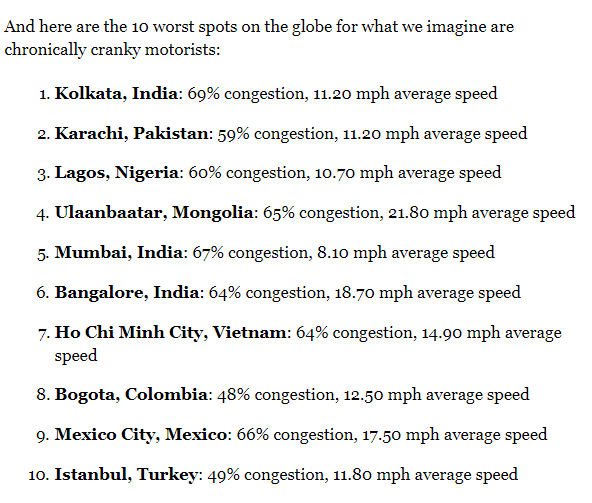 Forbes states that the list was arrived at after considering the following: an analysis of local congestion levels, an average cost of parking and fuel, average roadway speeds, air pollution levels, number of traffic injuries, and road quality.