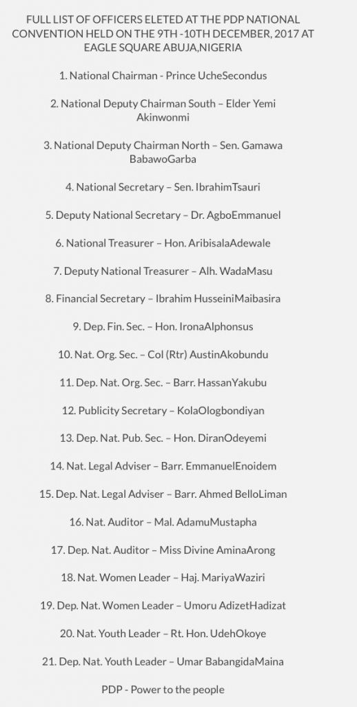 Full List Of Elected Officials at the PDP National Convention 2017