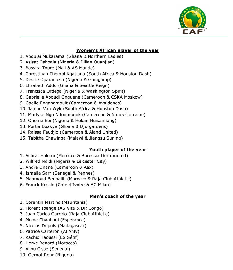 The 2018 Caf Awards nominees have been released by the football body, the Confederation of African Football (Caf) on Friday.