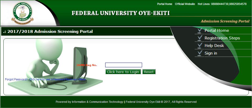 The Federal University Oye-Ekiti (FUOYE) hereby informs all applicants who have applied to FUOYE in the 2017 POST-UTME to visit the screening portal http://screening.fuoye.edu.ng in order to participate in the online screening exercise between Monday 11th – Friday 13th October, 2017.