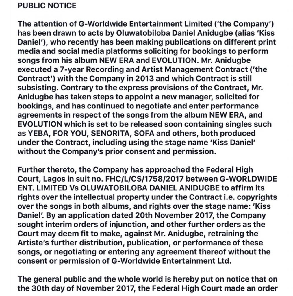 “The attention of G-Worldwide Entertainment Limited (‘the Company’) has been drawn to acts by Oluwatobiloba Daniel Anidugbe (alias ‘Kiss Daniel’), who recently has been making publications on different print media and social media platforms soliciting for bookings to perform songs from his album NEW ERA and EVOLUTION. Mr. Anidugbe executed a 7-year Recording and Artist Management Contract (’the Contract’) with the Company in 2013 and which Contract is still subsisting.