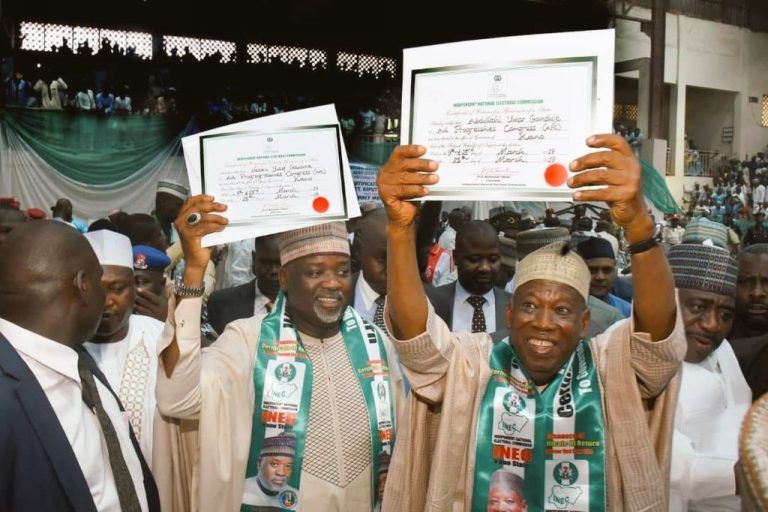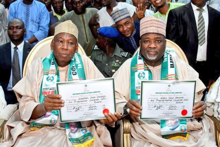 The All Progressives Congress (APC) governorship candidate, with his deputy, Nasiru Gawuna, alongside other elected lawmakers received their certificate of return today in Kano.