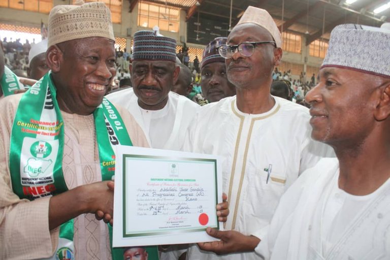 Abdullahi Ganduje, the incumbent governor of Kano state, has received his certificate of the return from the Independent National Electoral Commission (INEC).