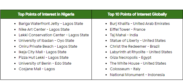 All in Lagos State, the Bariga Waterfront Jetty, Nike Art Gallery, and Lekki Conservation Centre, were the three most clicked on places of interest in the country. Other places of interest identified by citizens in Nigeria include the University of Ibadan, in Oyo State and University of Benin in Edo State.