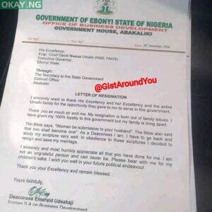 Her resignation letter reads: “I sincerely want to thank His Excellency and her Excellency and the entire Umahi family for the opportunity they gave to me to serve in this government.