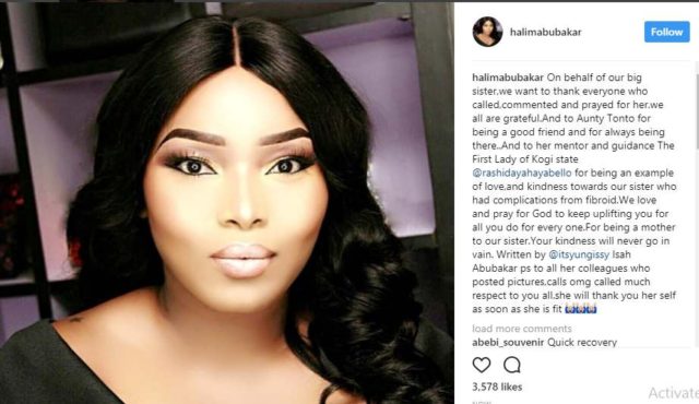 On behalf of our big sister,we want to thank everyone who called, commented and prayed for her.we all are grateful.And to Aunty Tonto for being a good friend and for always being there..And to her mentor and guidance The First Lady of Kogi state @rashidayahayabello for being an example of love,and kindness towards our sister who had complications from fibroid.We love and pray for God to keep uplifting you for all you do for every one.For being a mother to our sister.Your kindness will never go in vain. Written by @itsyungissy Isah Abubakar”