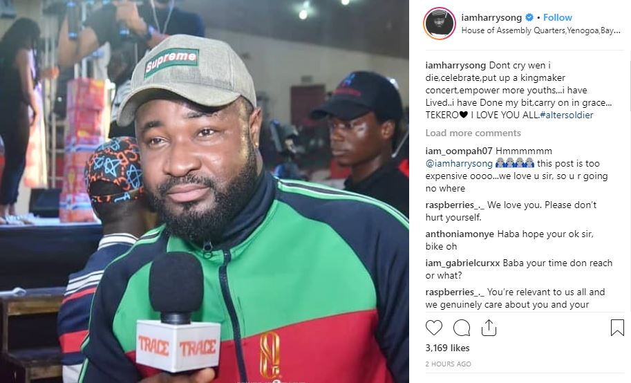 The singer made what would be an early WILL as he makes suggestions about dying. Harrysong said no one should cry for him when he dies. He goes on to say a concert should be organized in his stead when he is long gone.
