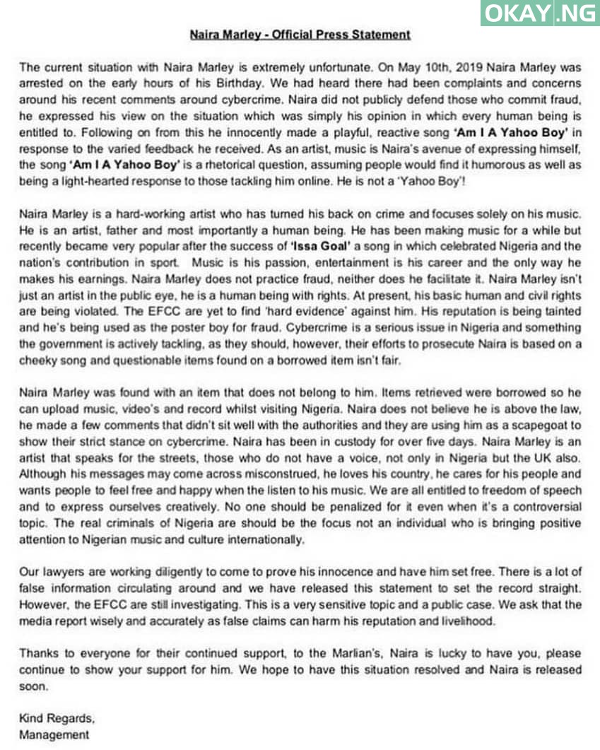 The management of Nigerian musician, Naira Marley, have released a statement on the arrest of its artiste by the Economic and Financial Crimes Commission (EFCC).