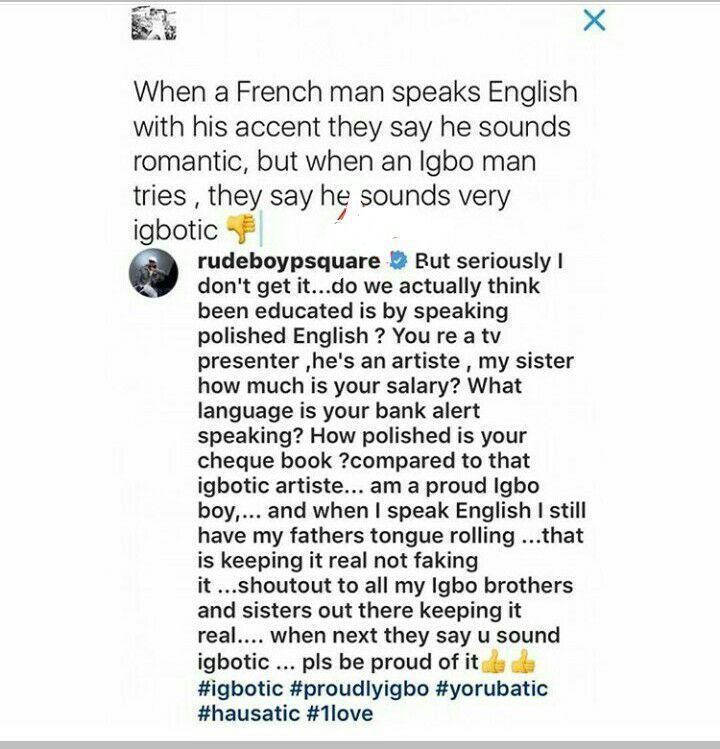‘But seriously I don’t get it…do we actually think been educated is by speaking polished English ? You re a tv presenter ,he’s an artiste , my sister how much is your salary? What language is your bank alert speaking? How polished is your cheque book ?compared to that igbotic artiste… am a proud Igbo boy,… and when I speak English I still have my fathers tongue rolling …that is keeping it real not faking it …shoutout to all my Igbo brothers and sisters out there keeping it real…. when next they say u sound igbotic … pls be proud of it…. #joke …by the way those of you that use to cover your exam papers during exams back then , I hope by now you all are MD’s in oil and banking sector or even a presidenthappy weekend#igbotic #proudlyigbo #yorubatic #hausatic #1love.’