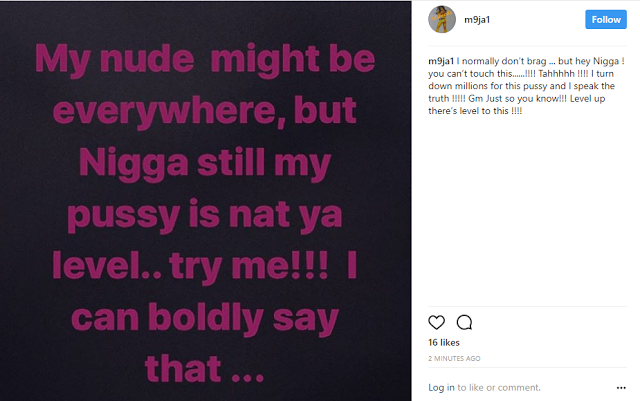 I normally don’t brag … but hey Nigga ! you can’t touch this……!!!! Tahhhhh !!!! I turn down millions for this p**ssy and I speak the truth !!!!! Gm Just so you know!!! Level up there’s level to this !!!!