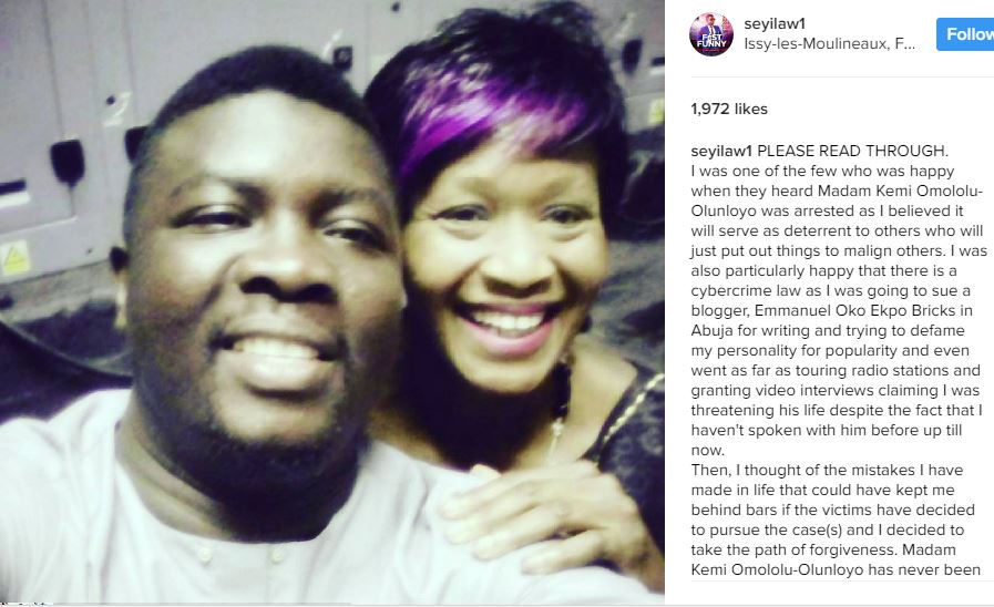 Ace Nigerian comedian, Seyi Law, who once had a face-off with arrested controversial Nigerian Journalist, Kemi Olunloyo, who made a public post that Seyi Law’s daughter is obese, has disclosed that he was very happy to hear that Kemi was arrested.