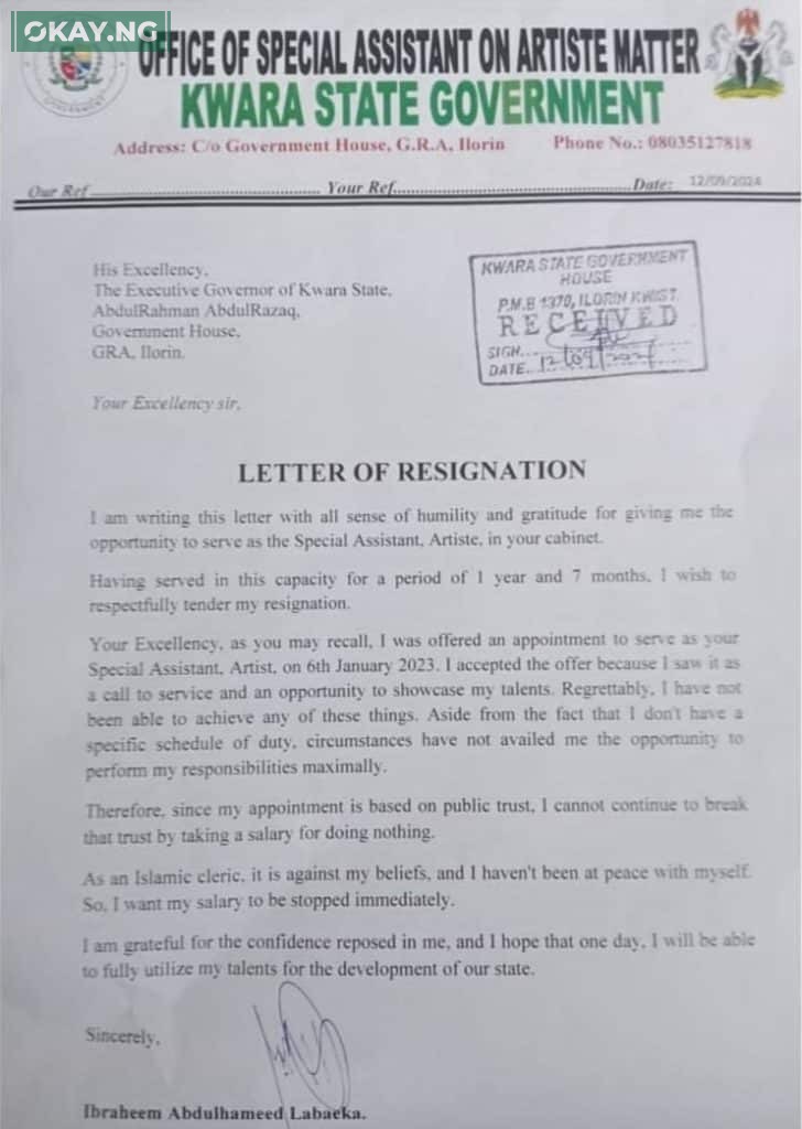 Islamic singer and cleric Ibraheem “Labaeka” Abdulhameed has announced his resignation from his position as the Special Assistant on Artiste Matters to Kwara State Governor Abdulrahman AbdulRazaq, Okay.ng reports.