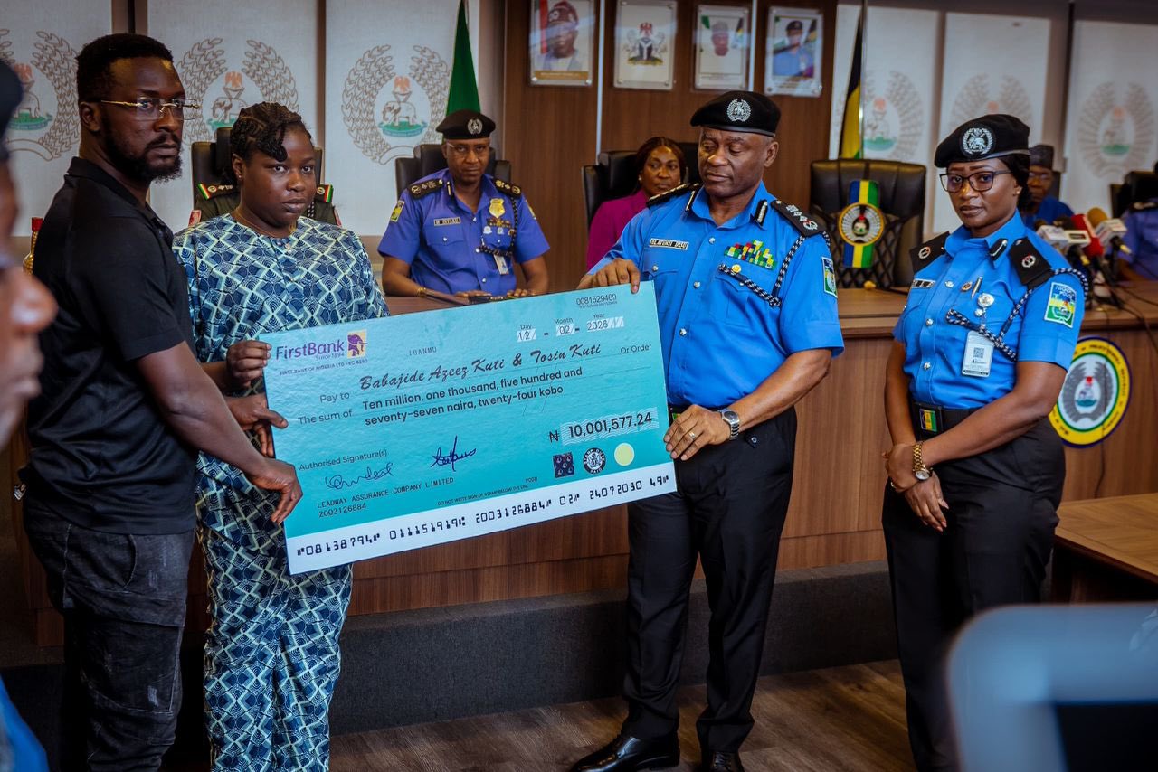 IGP Olatunji Rilwan Disu presents a cheque of ten-million Naira to a family at the Force Headquarters in Abuja on Wednesday, 18 March 2026.