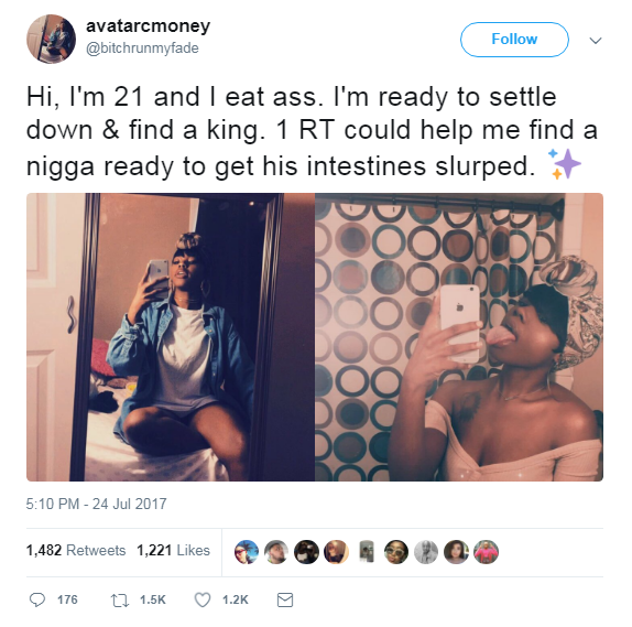 Hi, I’m 21 and I eat ass. I’m ready to settle down & find a king. 1 RT could help me find a nigga ready to get his intestines slurped.