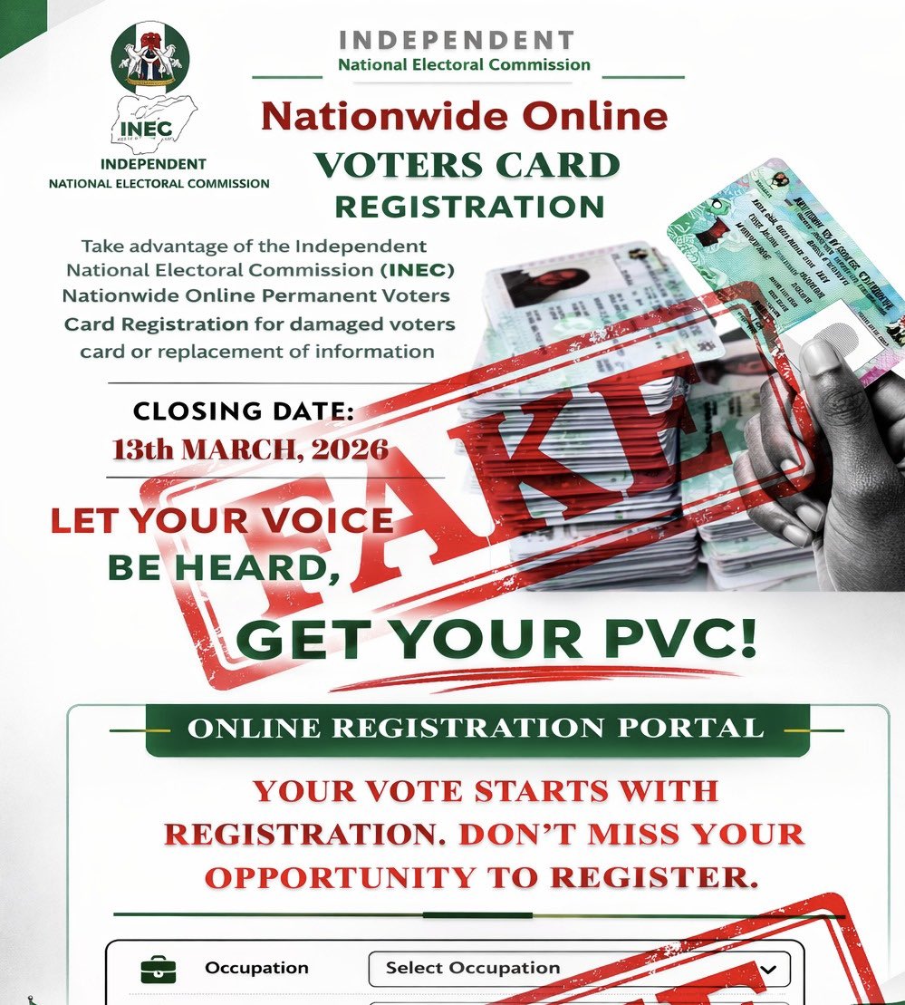 ABUJA, NIGERIA – The Independent National Electoral Commission (INEC) has alerted the public to a fraudulent website circulating under the title “INEC VOTERS CARD ONLINE REGISTRATION,” warning that the platform is fake, misleading, and not authorized by the Commission.