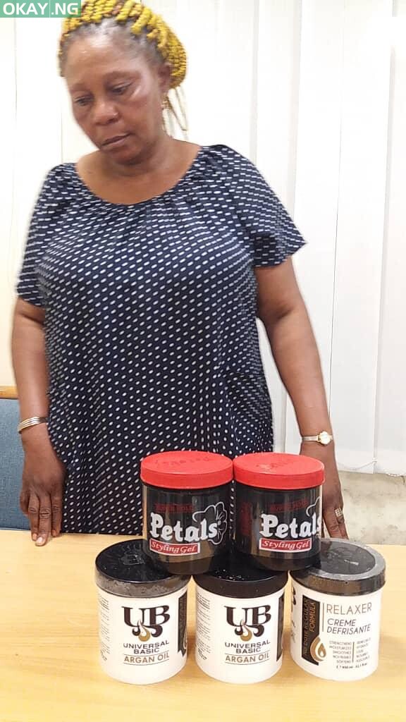 The statement revealed that the drugs found on her were concealed in five containers of hair relaxer cream.