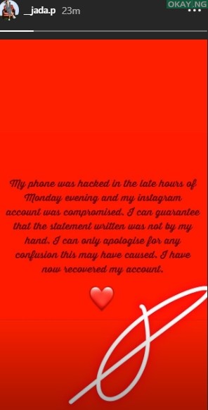 Jada in recent status claimed that her Instagram account was compromised after her phone was hacked.
