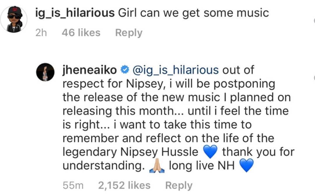 “Our of respect for Nipsey, I will be postponing the release of the new music I planned on releasing this month. Until I feel the time is right.