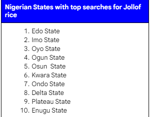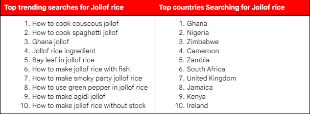 Recent search results reveal the top trending search for Jollof rice as, ‘How to cook couscous jollof’, Ghana is the top country searching for Jollof Rice and Edo State has the top number of searches for Jollof rice in Nigeria.