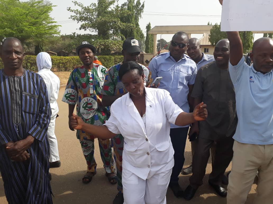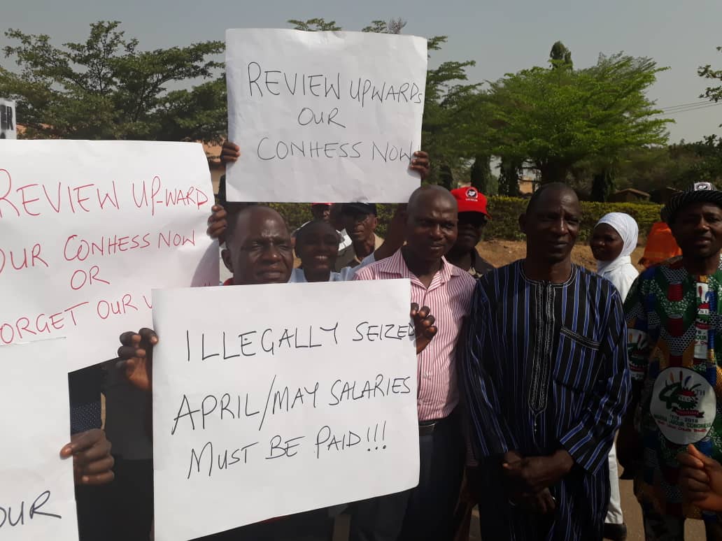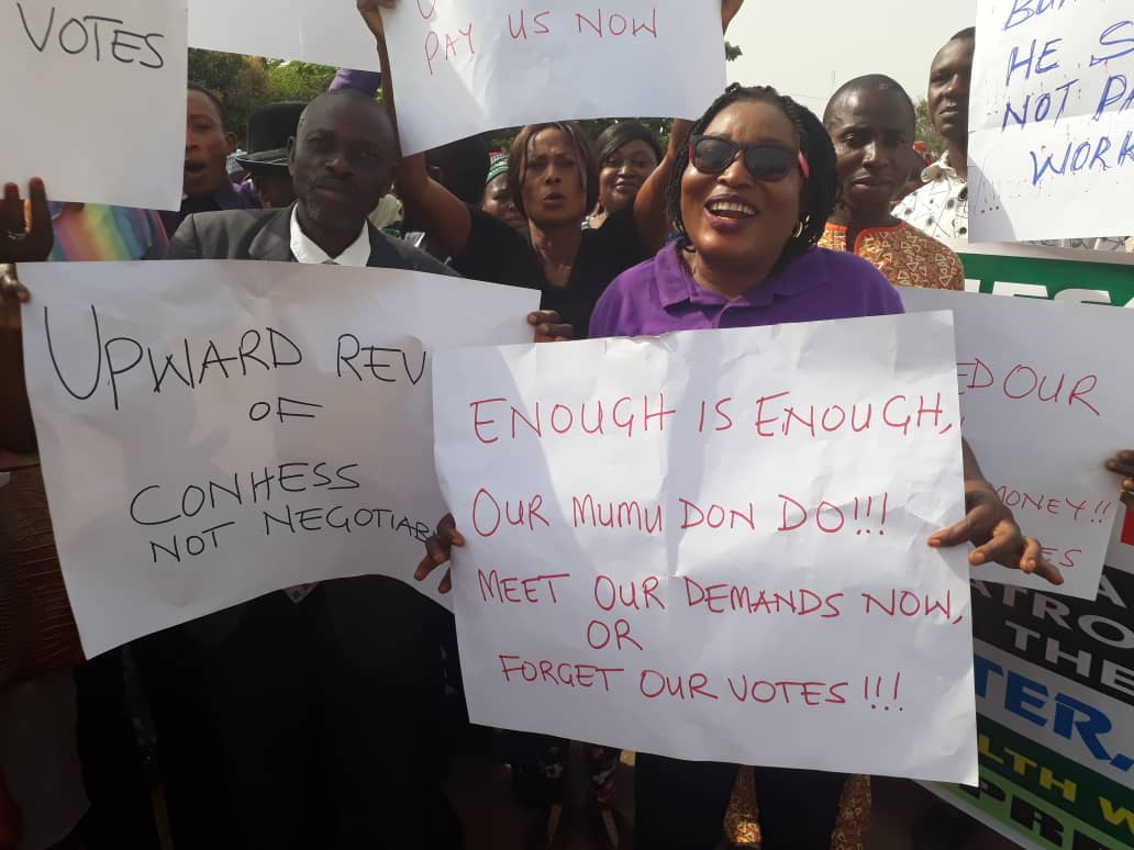 Attached photos: University of Abuja branch of Joint Health Sector Union (JOHESU) protesting alleged discrimination in upward review of CONHESS and withholding of salaries, among other issues.