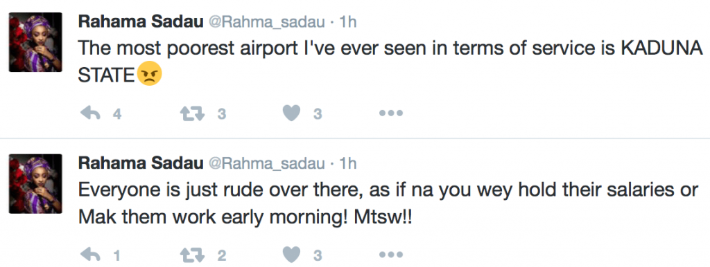 Nigerian actress, Rahama Sadau took to her social media page to put the management and staff of Kaduna airport on blast for what she described as the poorest service offered by any airport in the country.