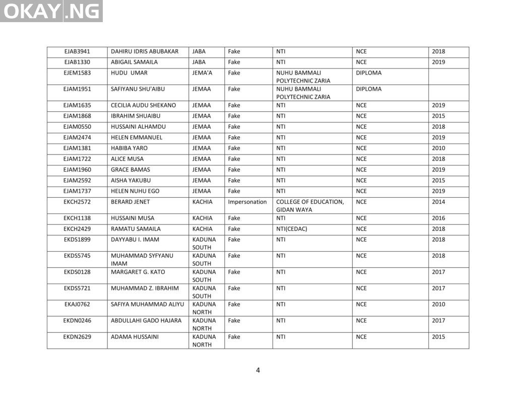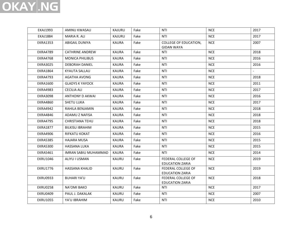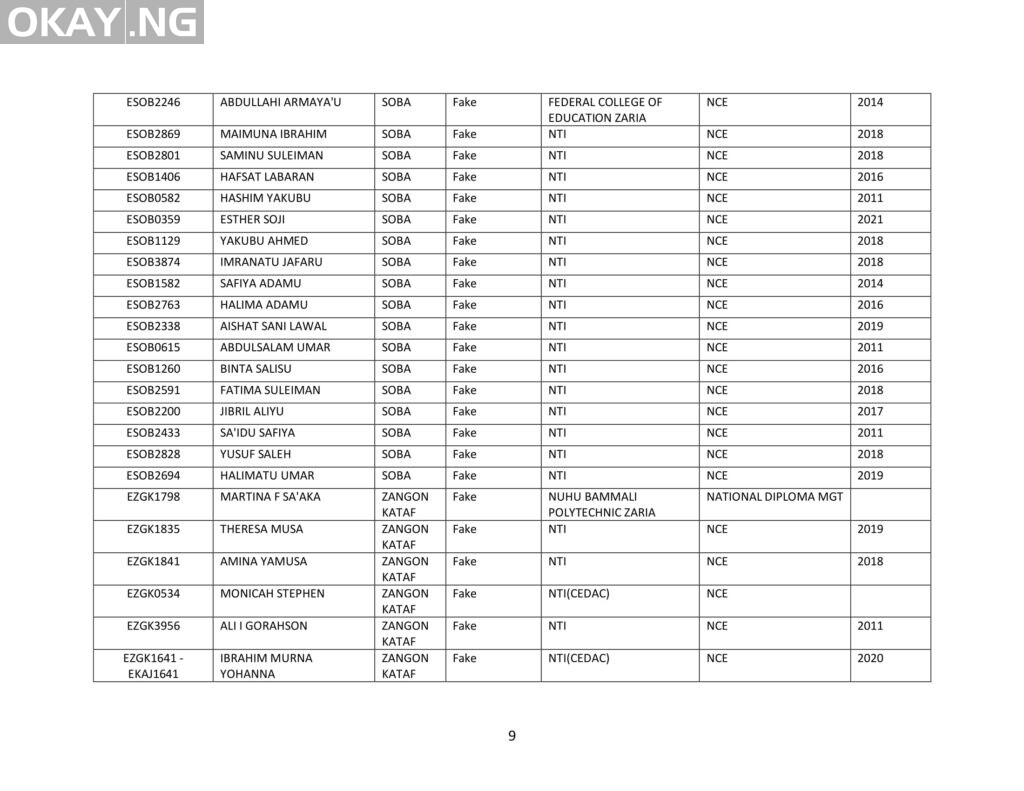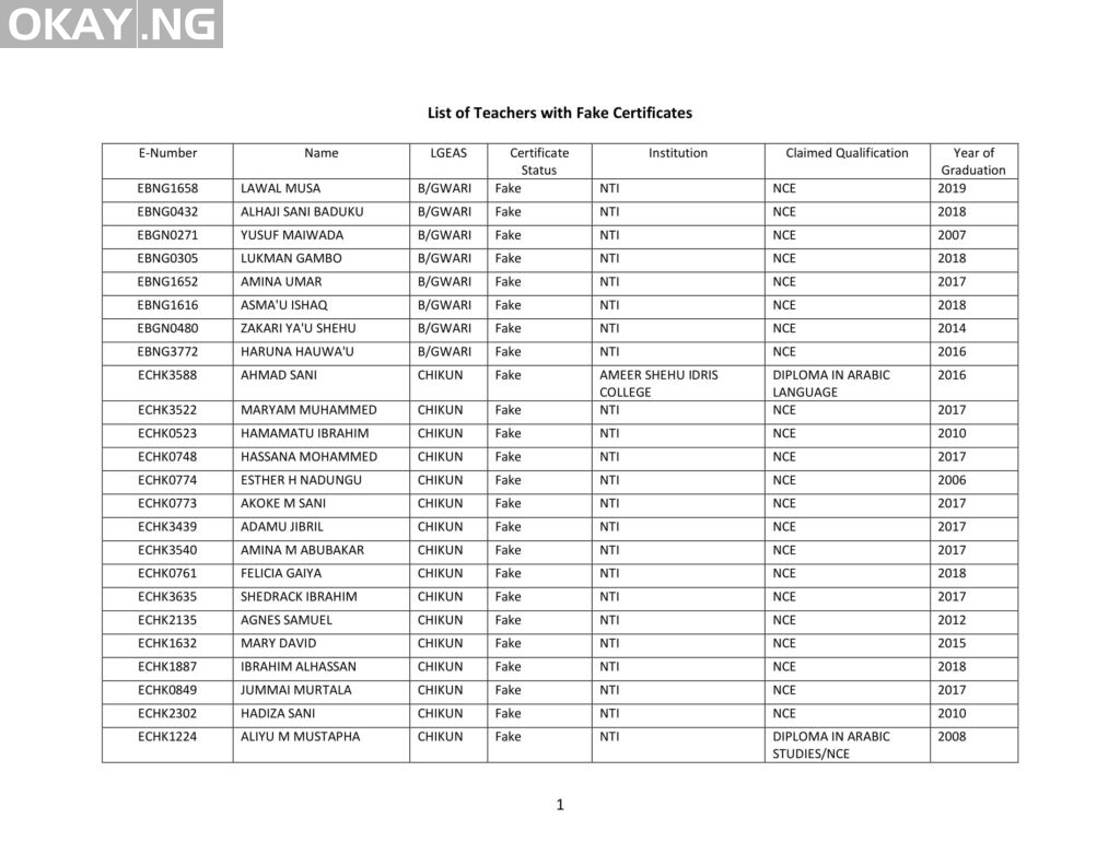 The Kaduna State Government has released the full list of 233 teachers to be dismissed for presenting fake certificates to get employed.