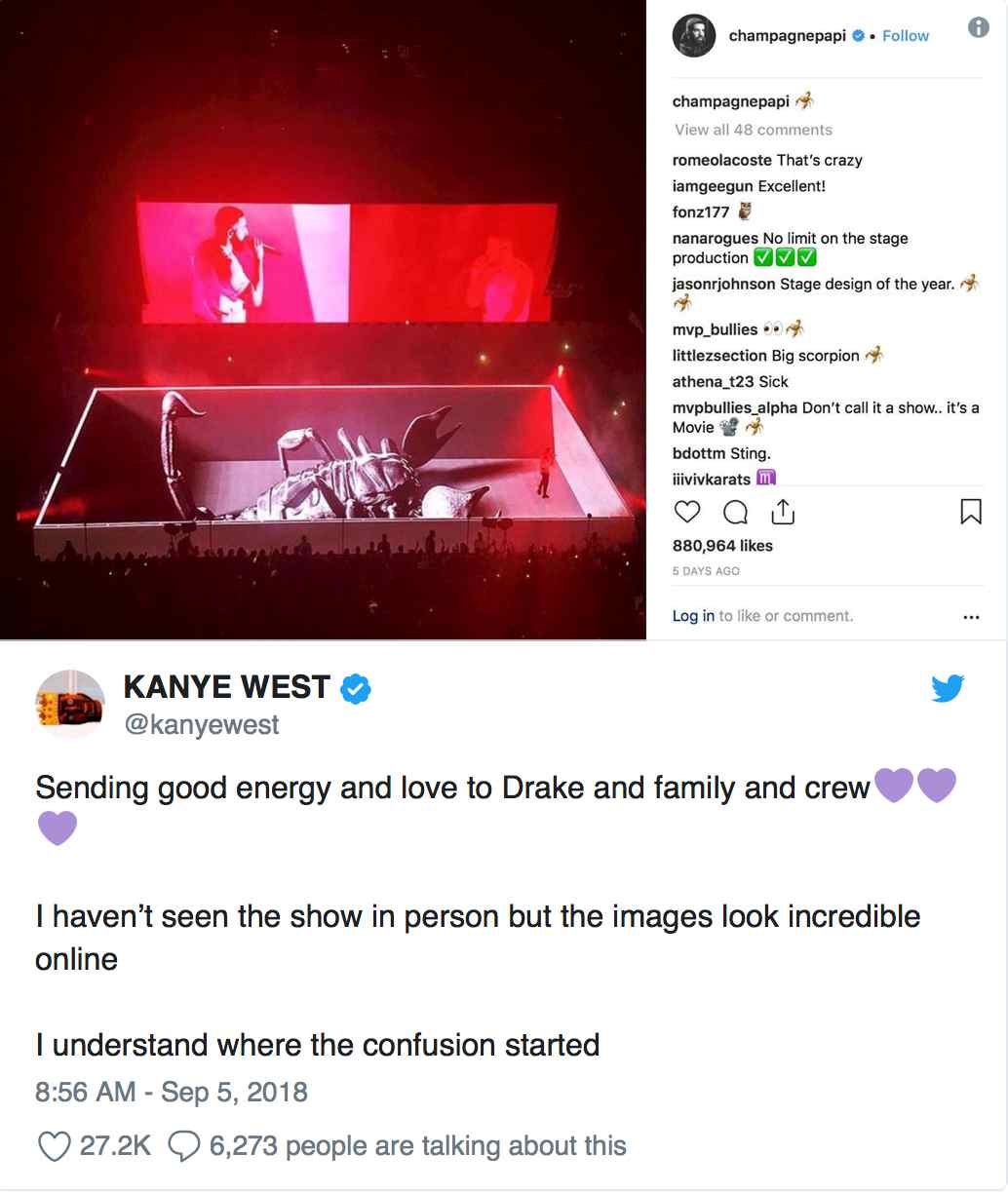 “Sending good energy and love to Drake and family and crew,” West, 41, tweeted alongside a photo of Drake and Migos’ stage for their ongoing Aubrey and the Three Amigos tour. “I haven’t seen the show in person but the images look incredible online. I understand where the confusion started.”