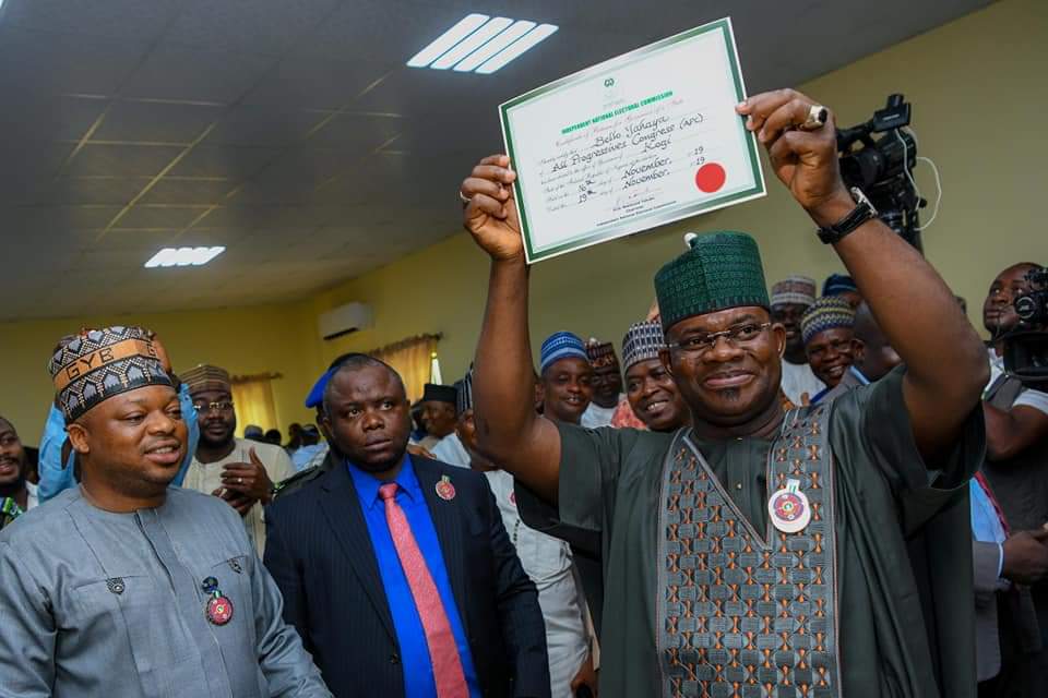 The Independent National Electoral Commission (INEC) has on Thursday presented certificate of return to candidate of the All Progressives Congress (APC) in the just concluded Kogi governorship election, Yahaya Bello and his deputy and running mate, Edward Onoja.