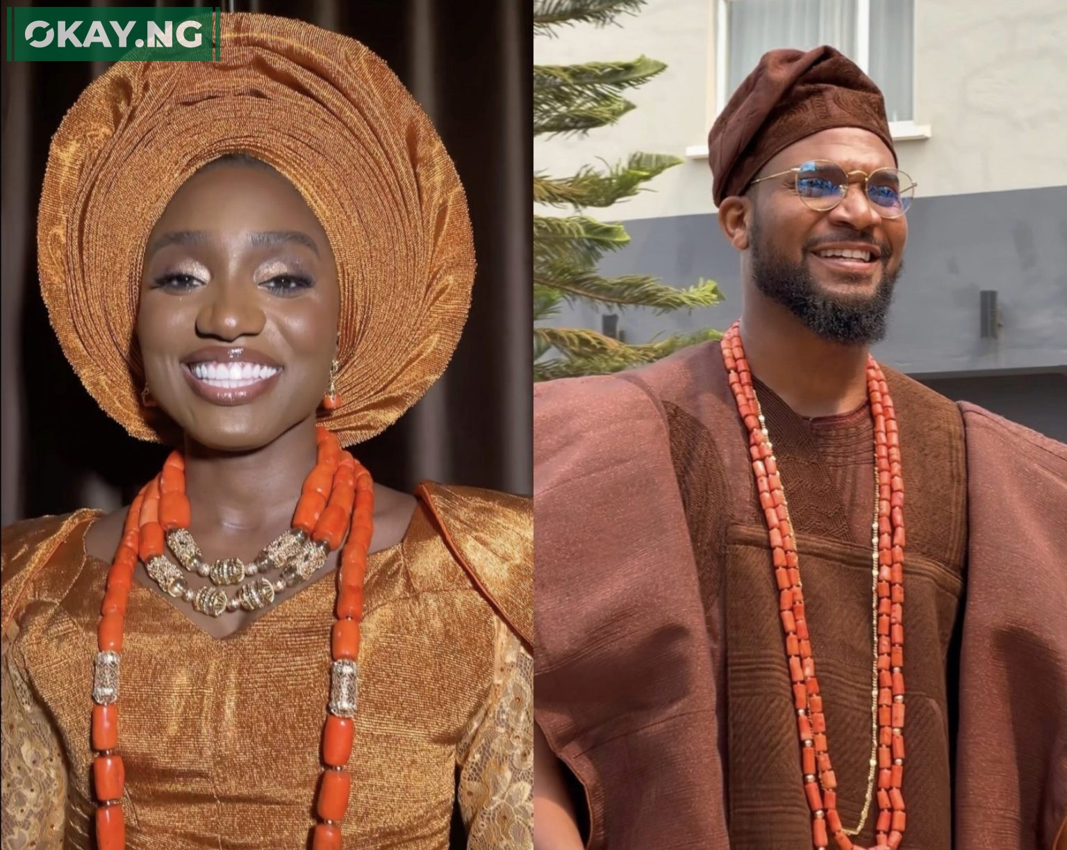 In the trending pictures and videos, the actor can be seen wearing a brown agbada, red coral beads, and brown shoes while sitting on his mother’s lap. Another video showed Tiwi, covered with a veil, being escorted to her husband by her friends.