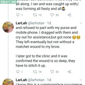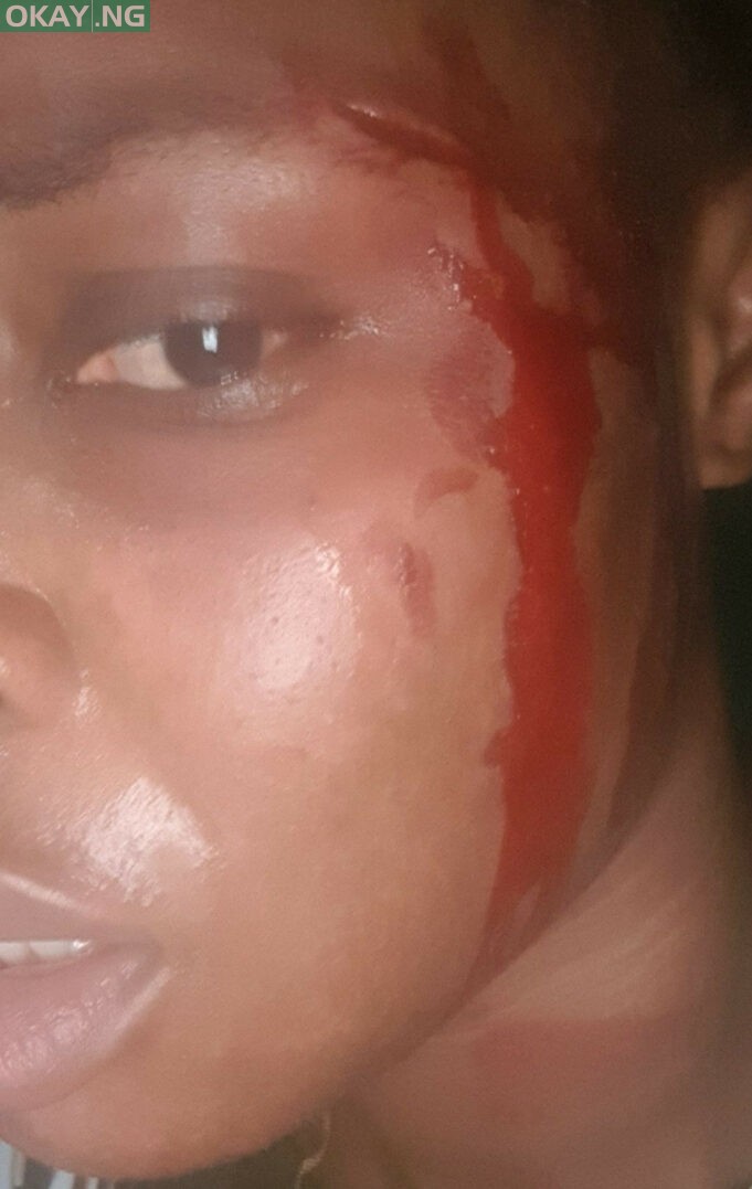 A Nigerian lady has taken to Twitter to reveal how a bike rider and a passenger used machete to cut her face heavily after she refused to give them her purse and her phone.