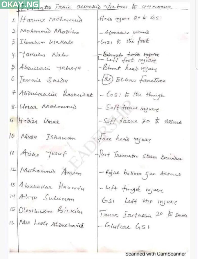 The names of the 16 victims of the Kaduna-Abuja train terror attack hospitalised at the 44 Army Reference Hospital have been revealed.