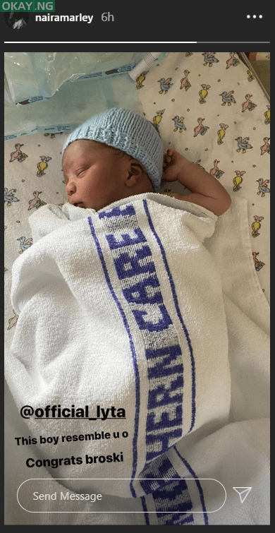 “@official_lyta This boy resemble u o. Congrats broski,” he wrote sharing a photo of Lyta’s child.