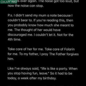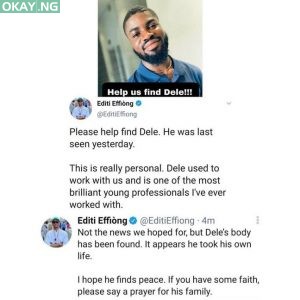 However today, the man took to his page to reveal that the dead body of Dele has been found and it’s clear that he committed suicide.