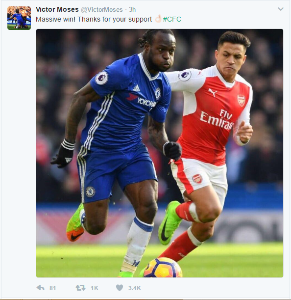 Moses, who was imperious at the rear, took to Twitter to praise his side’s win while thanking the fans for their supports.