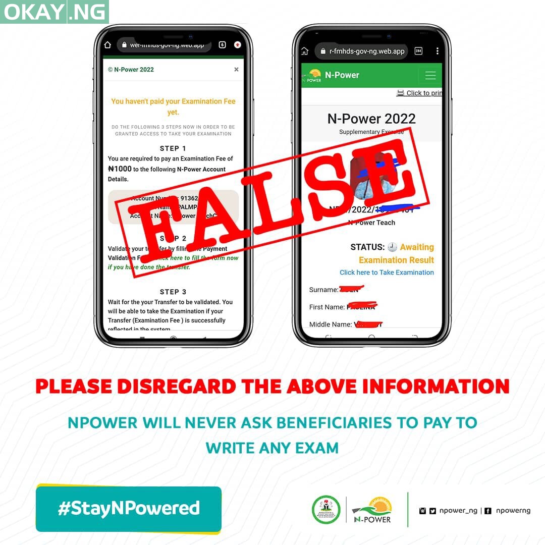 The N-Power has announced that it is not demanding for an examination fee payment from any of her applicants. Okay.ng understands.