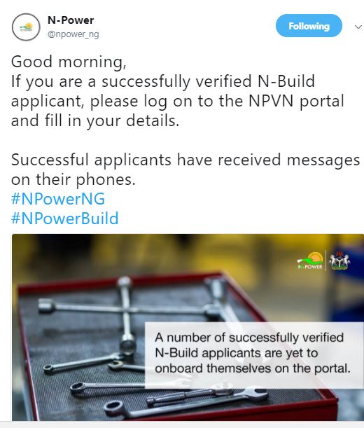 “If you are a successfully verified N-Build applicant, please log on to the NPVN portal and fill in your details,” the tweet read.