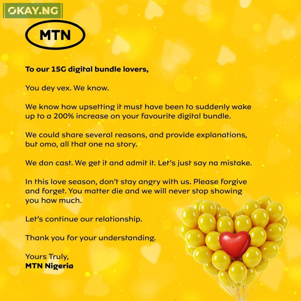 Telecommunications giant MTN Nigeria has issued a public apology to customers following backlash over the 200% price increase on its 15GB digital bundle.