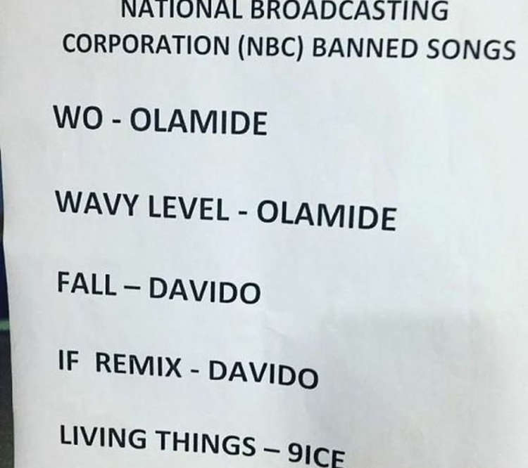 Other banned songs include Davido’s ‘Fall’, ‘IF’ remix, 9ice’s ‘Living Things’ and Olamide’s ‘Wavy Level’.