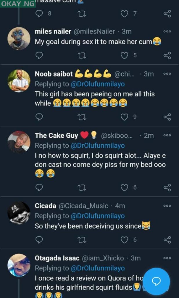 The doctor, Dr Olufinmilayo who took to Twitter to shed light on the issue, says squirt fluid comes from the bladder and it is essentially urine.
