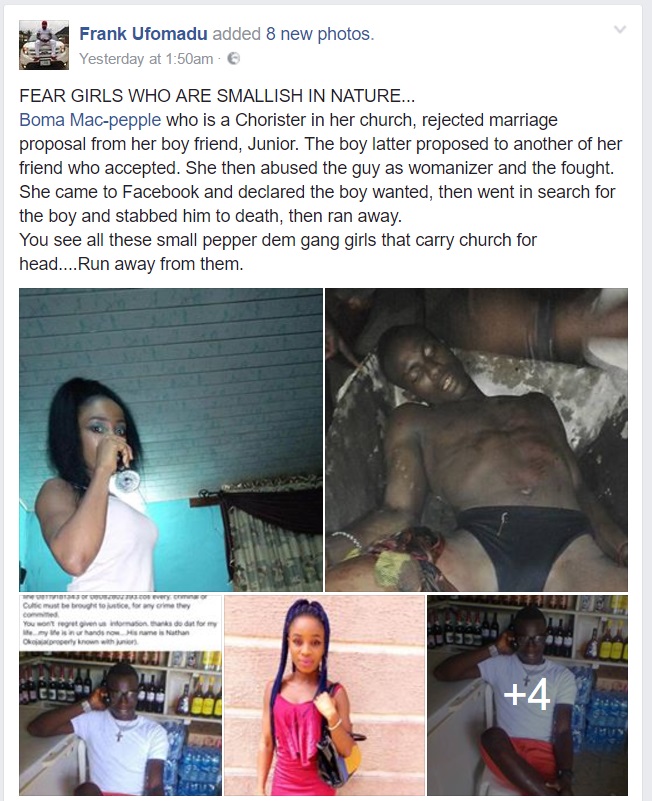 Boma Mac-pepple who is a Chorister in her church, rejected marriage proposal from her boy friend, Junior. The boy latter proposed to another of her friend who accepted. She then abused the guy as womanizer and the fought. She came to Facebook and declared the boy wanted, then went in search for the boy and stabbed him to death, then ran away.