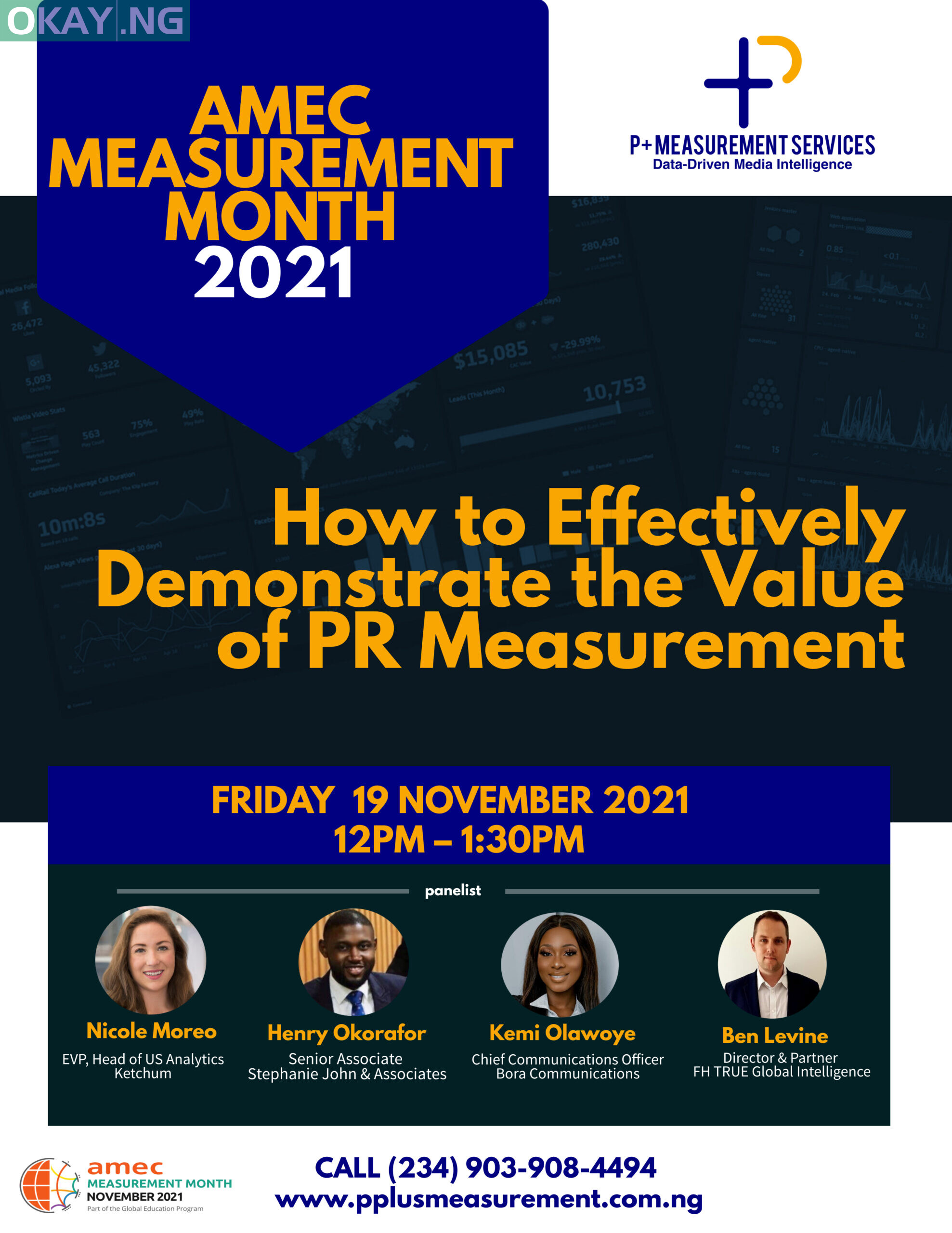 This year’s edition will bring together more than 160 members of the association in 86 different countries around the world and P+ Measurement Services, the foremost media intelligence agency and a member of AMEC is spearheading the 6th edition of the event in Nigeria with the theme: “How to Effectively Demonstrate the Value of PR Measurement.”