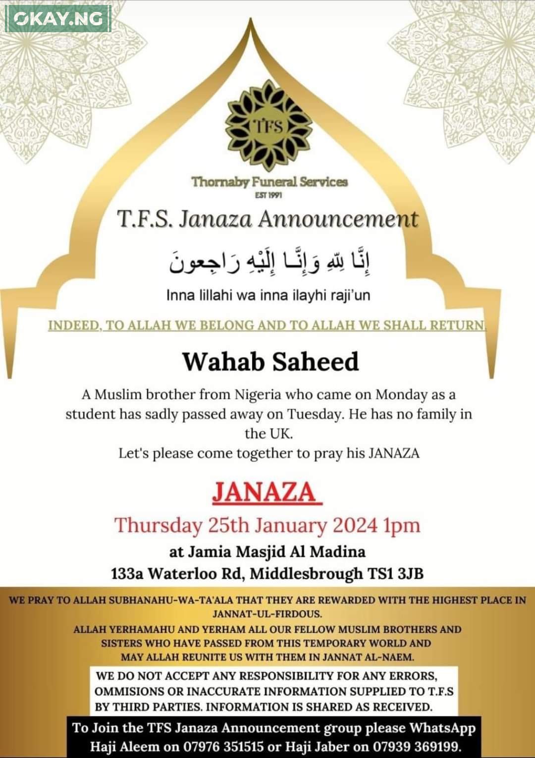 According to the Nigerians in the UK Community, Wahab’s death occurred on Tuesday, January 16, 2024.