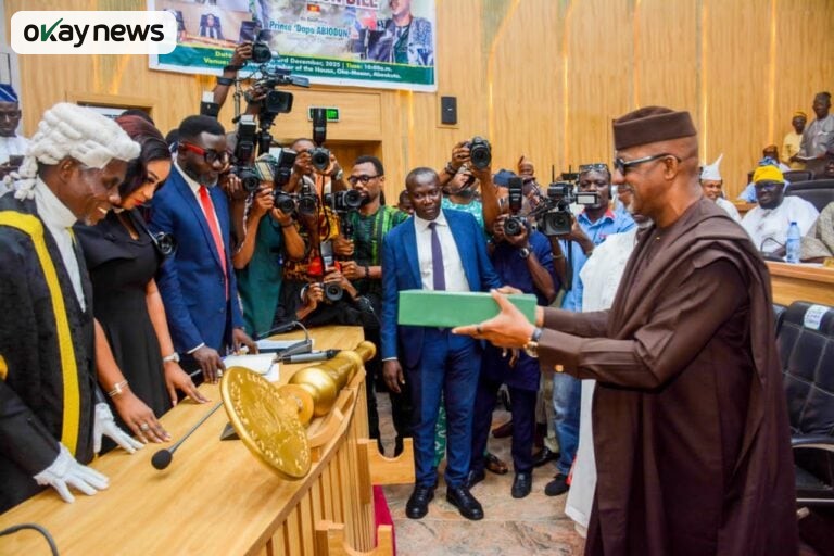 The Governor of Ogun State, Dapo Abiodun, on Wednesday formally presented the state’s 2026 Appropriation Bill totaling N1,668,997,993,125.44 to the Speaker of the State Assembly, Oludaisi Elemide, for legislative approval. The budget, themed the “Budget of Sustainable Legacy,” is designed to strengthen fiscal discipline, ensure sustainable development, and preserve the gains of previous administrations. Okay News reports.