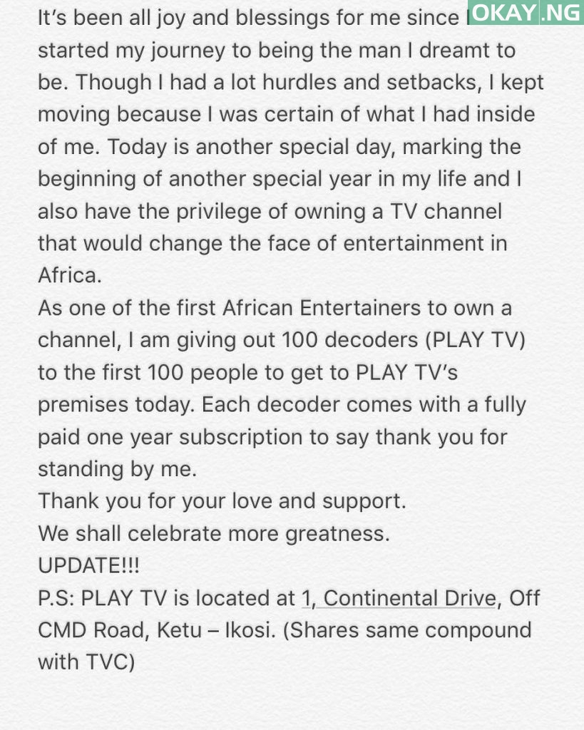 The YBNL Boss took to his Instagram page to make this announcement which he also revealed that they will be giving out 100 decoders to the First 100 people to get to Play TV’s office which is located at 1, Continental Drive, Off CMD Road, Ketu in Lagos.